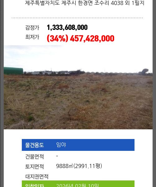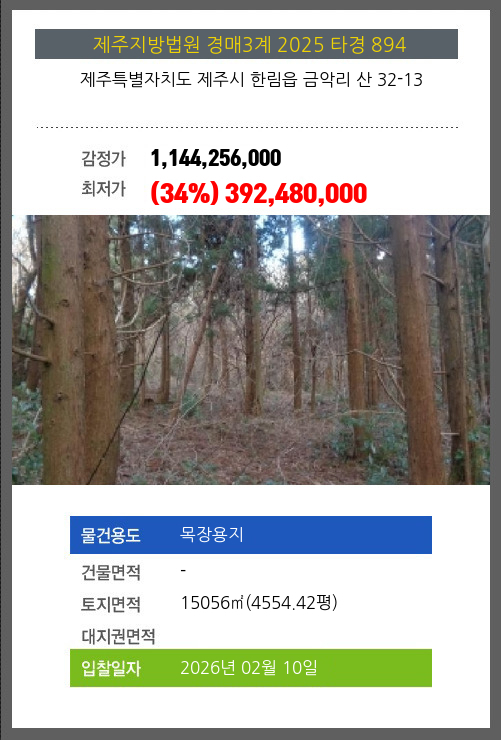 | 용도 | 목장용지 | 채권자 | 김** | 감정가 | 1,144,256,000 |