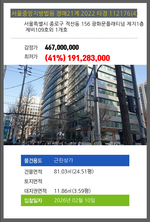 본건은 서울특별시 종로구 적선동 156 광화문플래티넘 제지1층 제비109호외 1개호