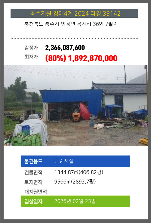 | 용도 | 근린시설 | 채권자 | 충**외1명 | 감정가 | 2,366,087,600 |