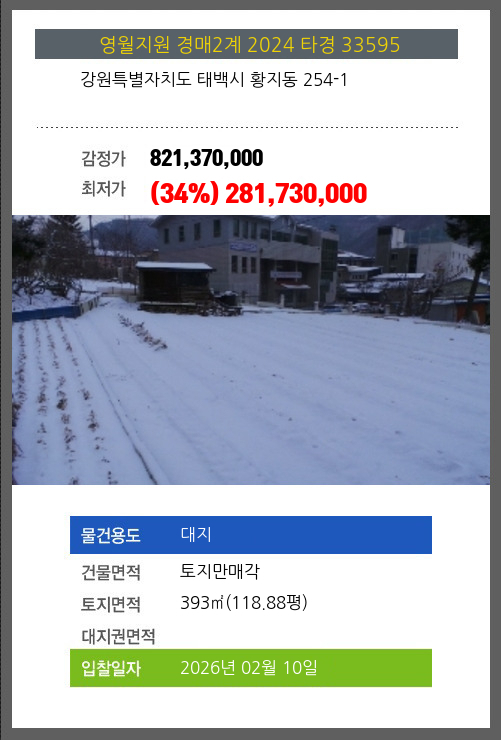 | 용도 | 대지 | 채권자 | 김** | 감정가 | 821,370,000 |