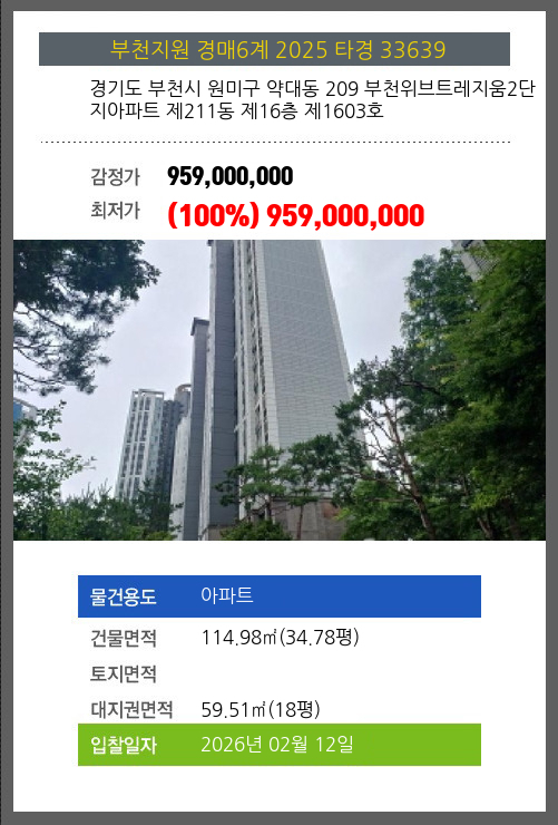 본건은 경기도 부천시 원미구 약대동 209 부천위브트레지움2단지아파트 제211동 제16층 제1603호