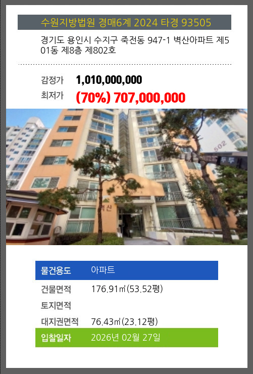 용인아파트경매 용인시 수지구 죽전동 947-1 벽산아파트 제501동 제8층 제802호 №2024 타경 93505