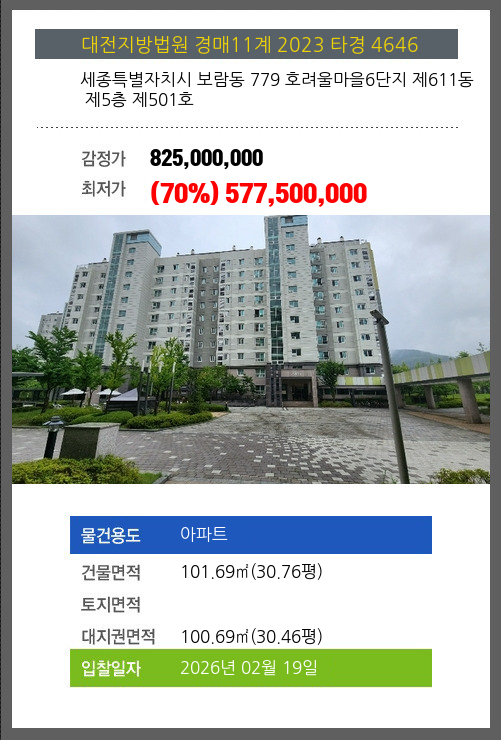 보람아파트경매 보람동 779 호려울마을6단지 제611동 제5층 제501호 №2023 타경 4646