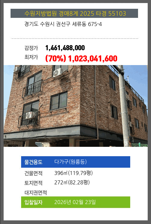 수원다가구(원룸등)경매 수원시 권선구 세류동 675-4 №2025 타경 55103
