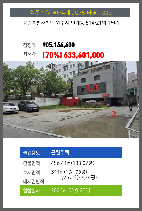 | 소재지 | [지번] 강원특별자치도 원주시 단계동 514-21외 1필지 [도로명 주소] 강원도 원주시 원문로 168-2외 1필지 |