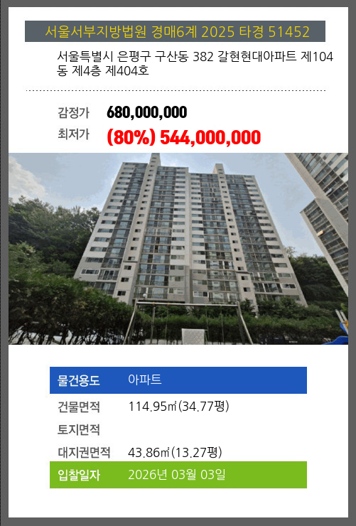 은평아파트경매 은평구 구산동 382 갈현현대아파트 제104동 제4층 제404호 №2025 타경 51452