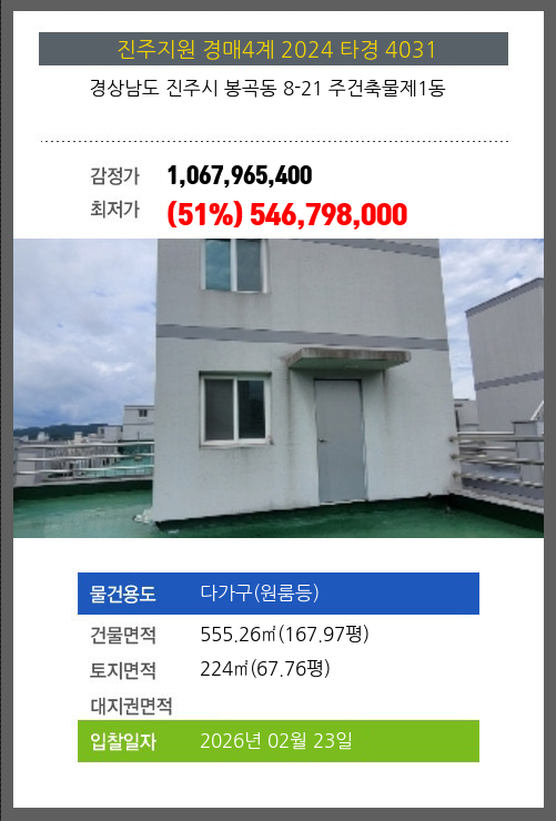 | 건물면적 | 555.26㎡ (167.97평) | 채무자 | 정** | 최저가 | (51%) 546,798,000 |