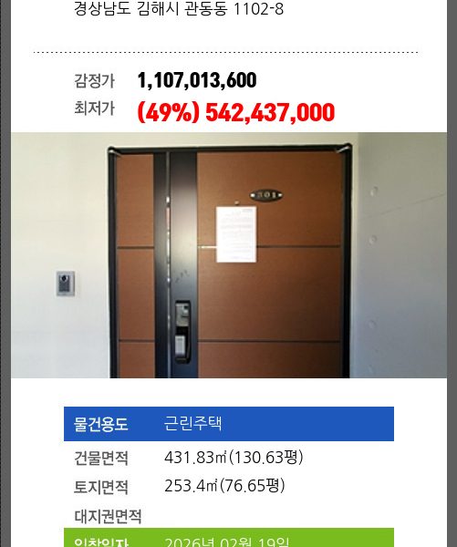 | 매각대상 | 공시가격3~4억 | 경매종류 | 임의경매 | 사건접수일 | 2025-04-11 |
