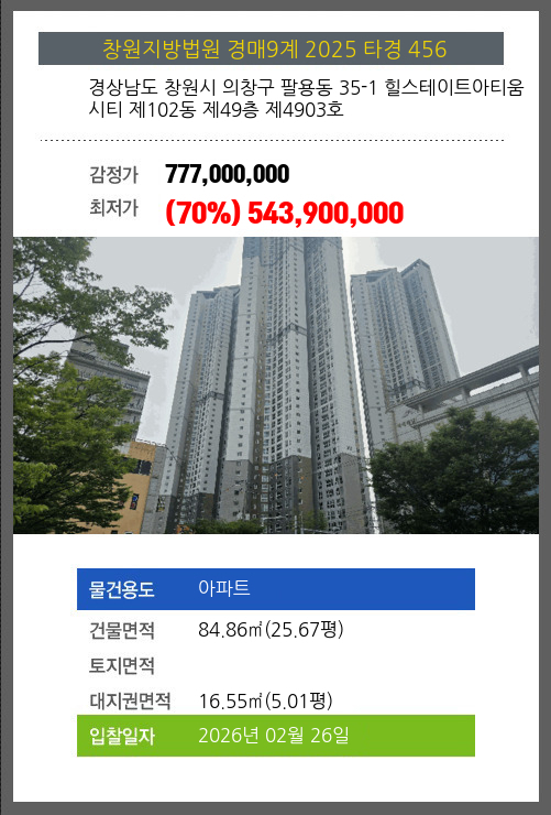 | 건물면적 | 84.86㎡ (25.67평) | 채무자 | 정** | 최저가 | (70%) 543,900,000 |