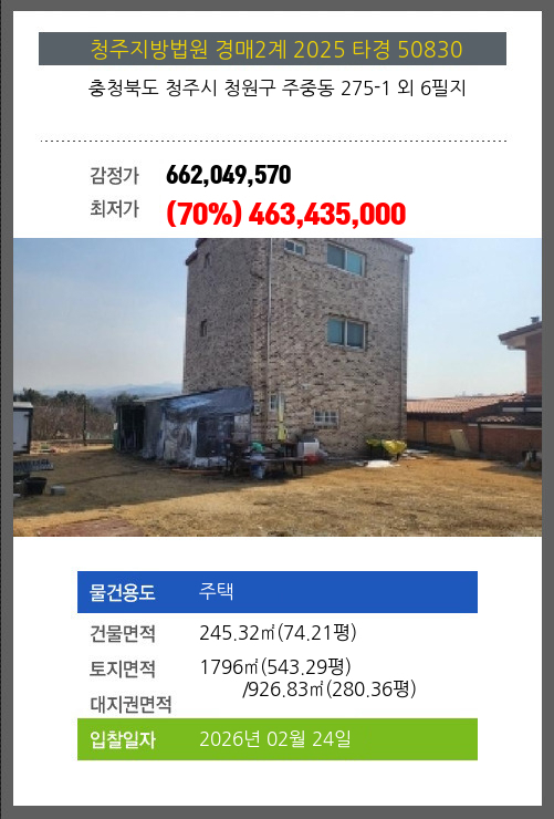 | 소재지 | [지번] 충청북도 청주시 청원구 주중동 275-1 외 6필지 [도로명 주소] 충북 청주시 청원구 주중로128번길 135외 6필지 |