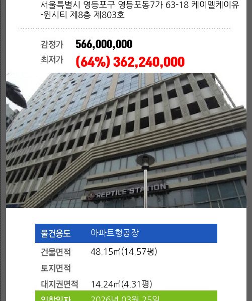 | 대지권 | 66.52㎡ (20.12평) | 소유자 | ㈜** | 보증금 | (10%) 76,160,000 |