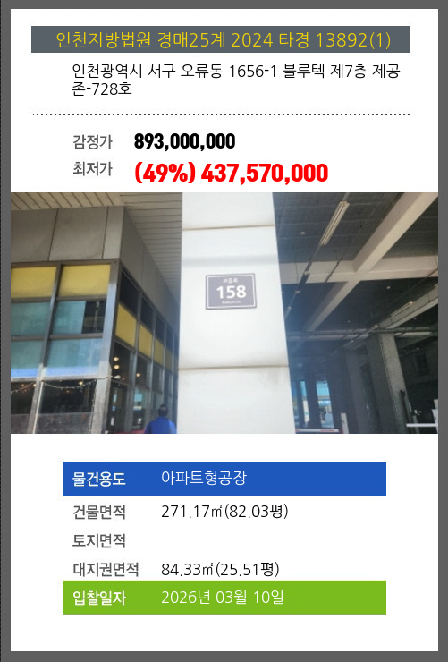 본건은 인천광역시 서구 오류동 1656-1 블루텍 제7층 제공존-728호