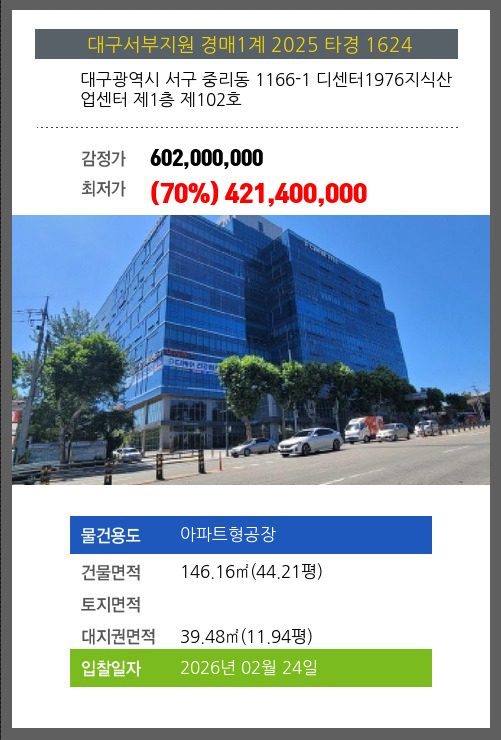 본건은 대구광역시 서구 중리동 1166-1 디센터1976지식산업센터 제1층 제102호