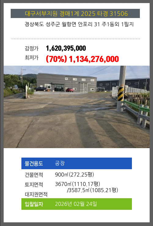 성주공장경매 성주군 월항면 안포리 31 주1동외 1필지 №2025 타경 31506