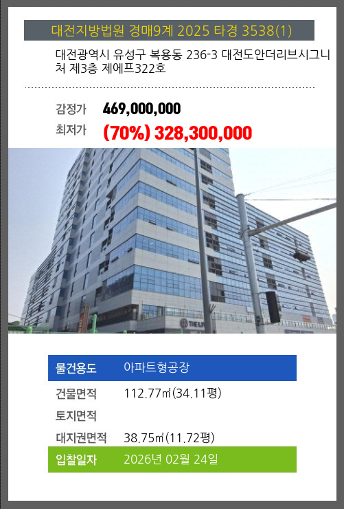 유성아파트형공장경매 유성구 복용동 236-3 대전도안더리브시그니처 제3층 제에프322호 №2025 타경 3538(1)
