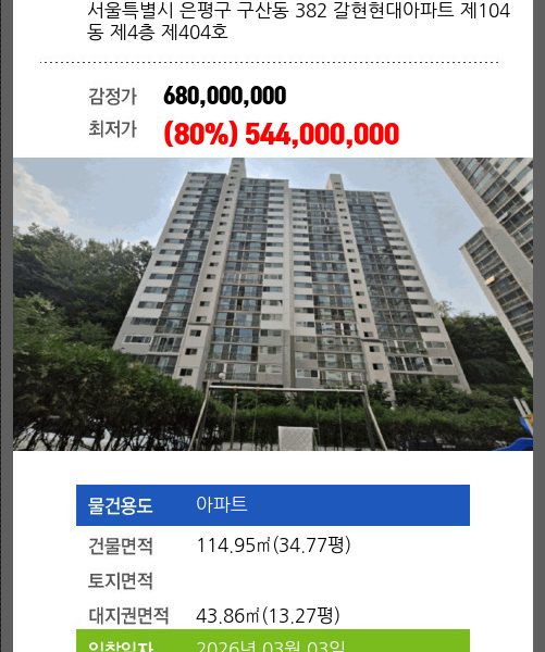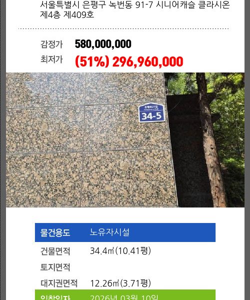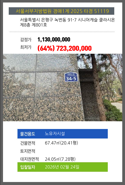 은평노유자시설경매 은평구 녹번동 91-7 시니어캐슬 클라시온 제8층 제801호 №2025 타경 51119