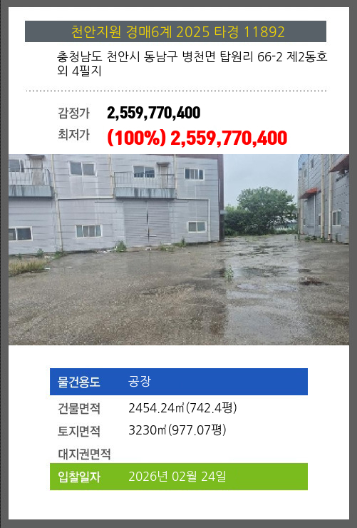 | 건물면적 | 2454.24㎡ (742.4평) | 채무자 | ㈜** | 최저가 | (100%) 2,559,770,400 |