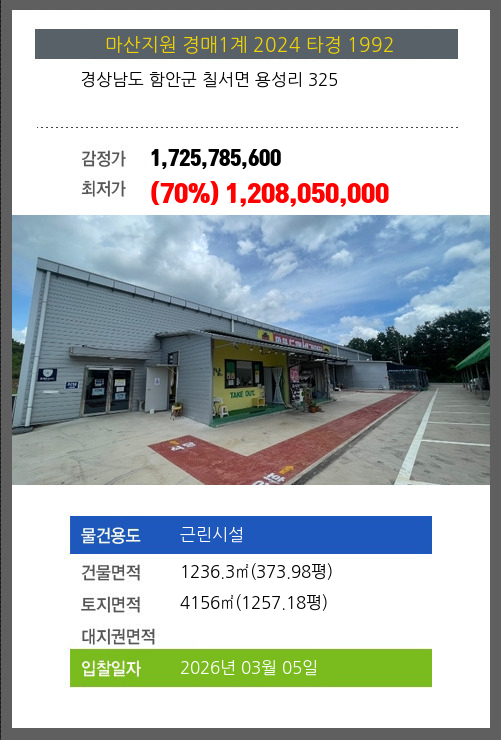 | 건물면적 | 1236.3㎡ (373.98평) | 채무자 | 이** | 최저가 | (70%) 1,208,050,000 |