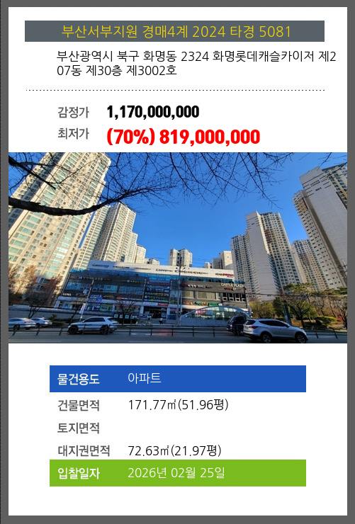 본건은 부산광역시 북구 화명동 2324 화명롯데캐슬카이저 제207동 제30층 제3002호