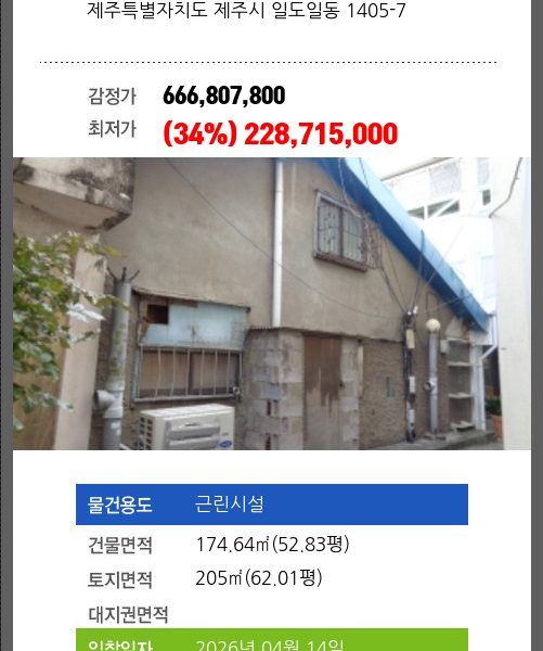 | 소재지 | [지번] 제주특별자치도 제주시 용담삼동 2296-2외 1필지 [도로명 주소] 제주특별자치도 제주시 어영길 10-3외 1필지 |