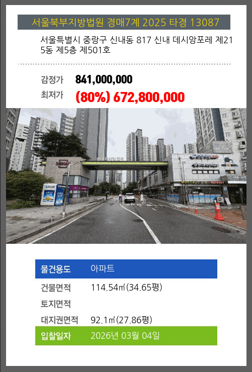 본건은 서울특별시 중랑구 신내동 817 신내 데시앙포레 제215동 제5층 제501호