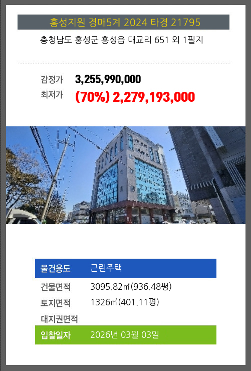 | 소재지 | [지번] 충청남도 홍성군 홍성읍 대교리 651 외 1필지 [도로명 주소] 충청남도 홍성군 홍성읍 의사로72번길 18 외 1필지 |