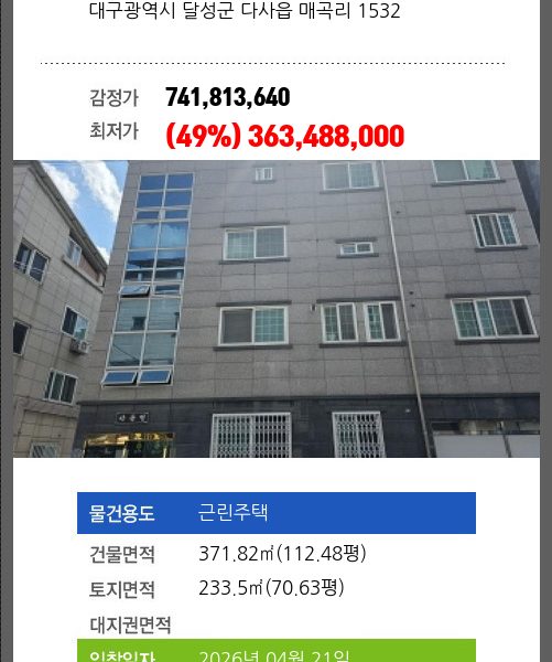 | 용도 | 다가구(원룸등) | 채권자 | 대** | 감정가 | 1,174,706,300 |