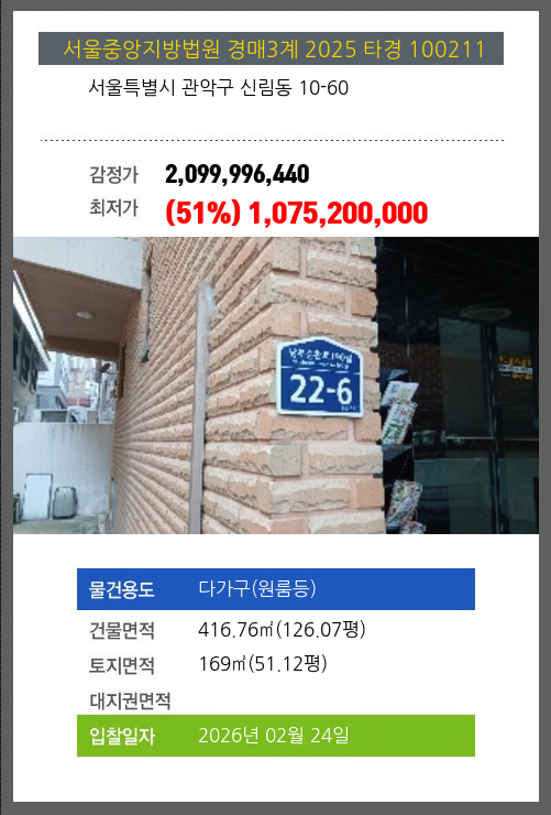 | 건물면적 | 416.76㎡ (126.07평) | 채무자 | 김** | 최저가 | (51%) 1,075,200,000 |