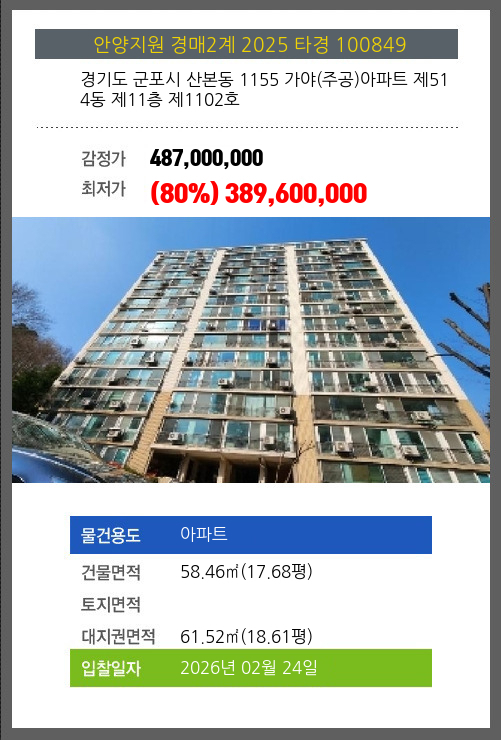 건물면적 58.46㎡ (17.68평) 채무자 김** 최저가 (80%) 389,600,000
