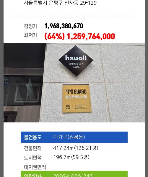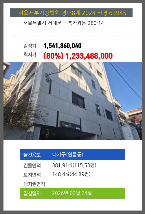 | 용도 | 다가구(원룸등) | 채권자 | 대** | 감정가 | 1,541,860,040 |