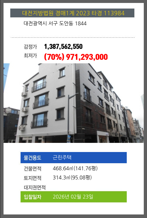 건물면적 468.64㎡ (141.76평) 채무자 박** 최저가 (70%) 971,293,000