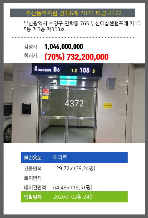 본건은 부산광역시 수영구 민락동 765 부산더샵센텀포레 제105동 제3층 제303호