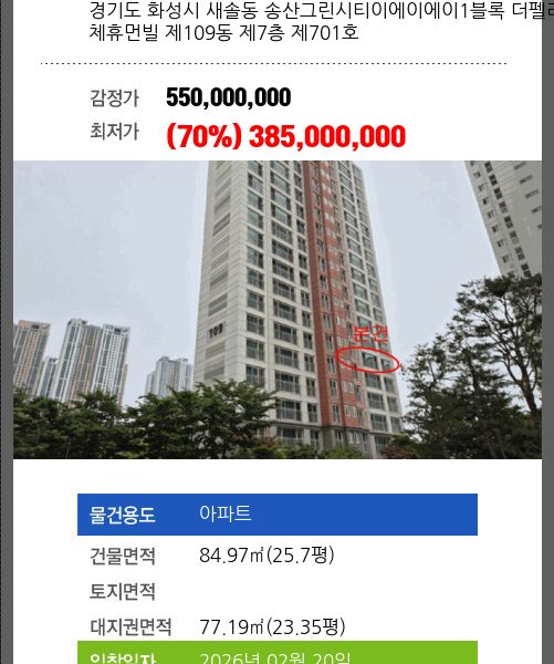 | 건물면적 | 129.95㎡ (39.31평) | 채무자 | ㈜** | 최저가 | (49%) 443,504,000 |
