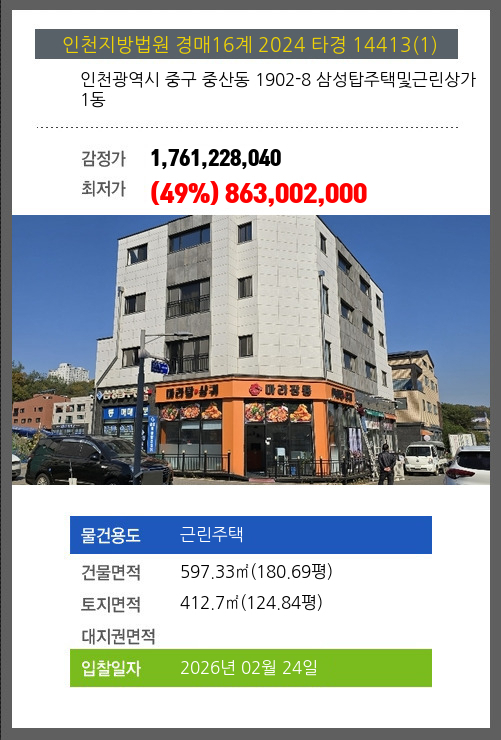 본건은 인천광역시 중구 중산동 1902-8 삼성탑주택및근린상가1동