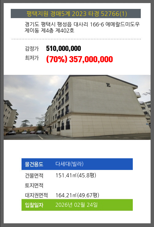본건은 경기도 평택시 팽성읍 대사리 166-6 에메랄드미도우 제이동 제4층 제402호