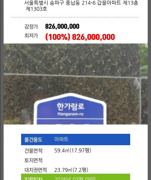 | 용도 | 아파트 | 채권자 | 송** | 감정가 | 642,000,000 |