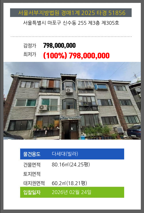 마포빌라경매 마포구 신수동 255 제3층 제305호 №2025 타경 51856