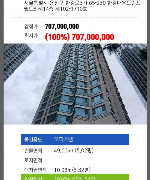 | 대지권 | 25.04㎡ (7.57평) | 소유자 | ㈜** | 보증금 | (10%) 50,320,000 |