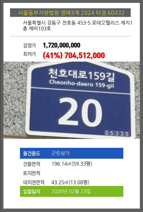 본건은 서울특별시 강동구 천호동 453-5 로데오팰리스 제지1층 제비103호