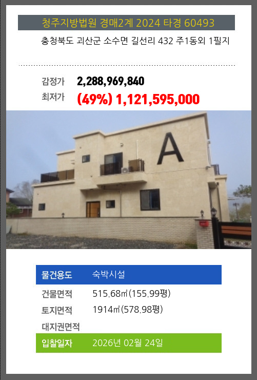 | 용도 | 숙박시설 | 채권자 | 청** | 감정가 | 2,288,969,840 |