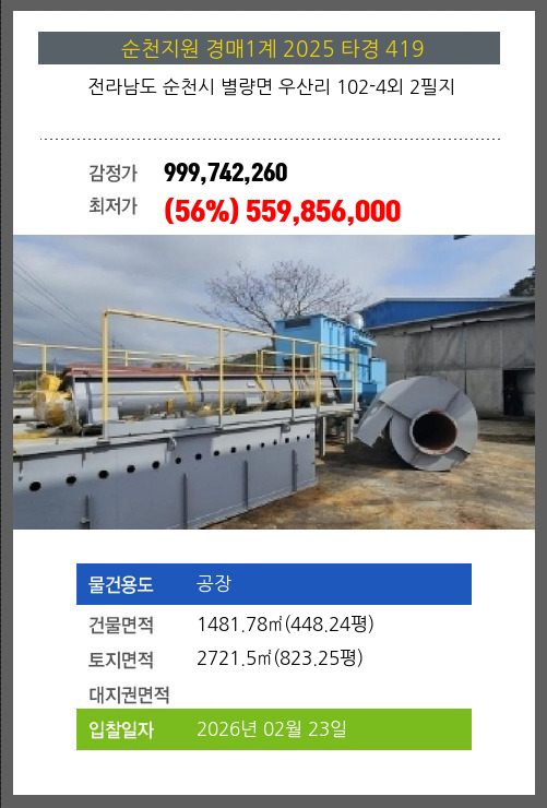 | 토지면적 | 2721.5㎡ (823.25평) | 소유자 | ㈜** | 보증금 | (10%) 55,985,600 |