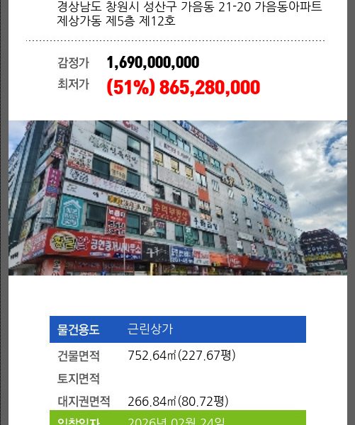 | 건물면적 | 1830.06㎡ (553.59평) | 채무자 | 차** | 최저가 | (56%) 2,317,674,000 |