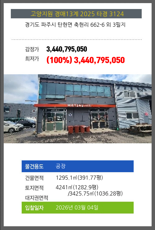 | 용도 | 공장 | 채권자 | ㈜** | 감정가 | 3,440,795,050 |