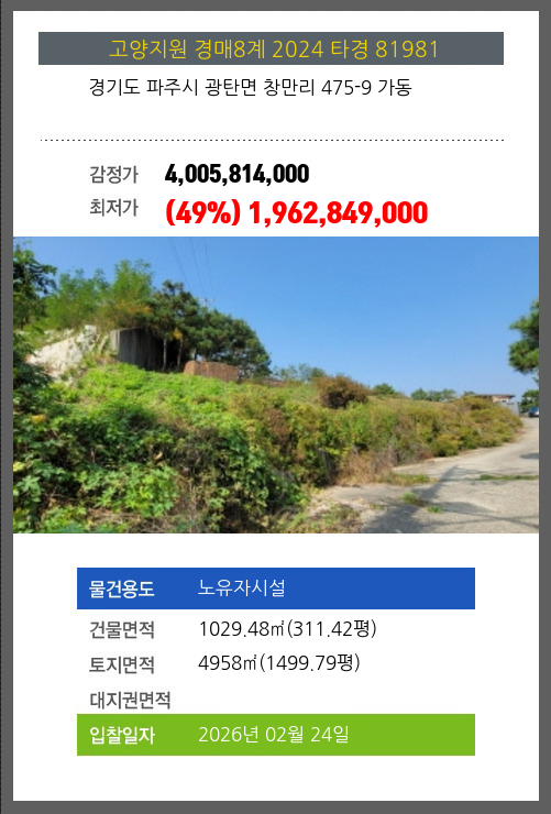 | 토지면적 | 4958㎡ (1499.79평) | 소유자 | 박** | 보증금 | (10%) 196,284,900 |