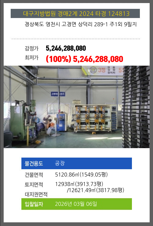 | 건물면적 | 5120.86㎡ (1549.05평) | 채무자 | 안** | 최저가 | (100%) 5,246,288,080 |