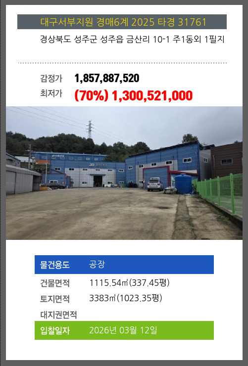 성주공장경매 성주군 성주읍 금산리 10-1 주1동외 1필지 №2025 타경 31761