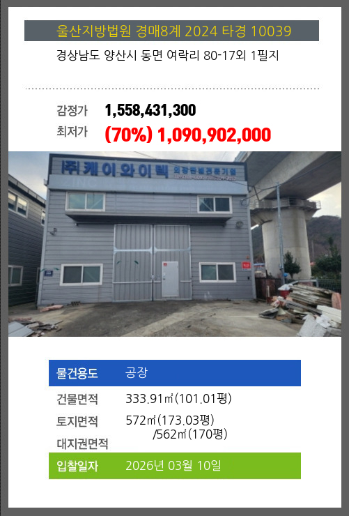 양산공장경매 양산시 동면 여락리 80-17외 1필지 №2024 타경 10039