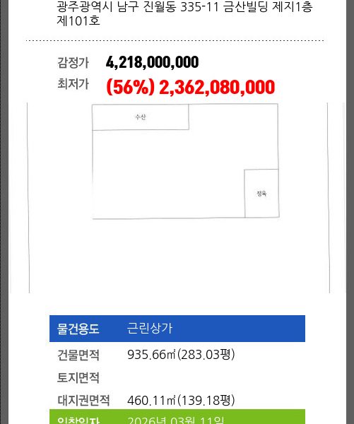 | 건물면적 | 1111.64㎡ (336.27평) | 채무자 | 강** | 최저가 | (56%) 1,590,062,000 |