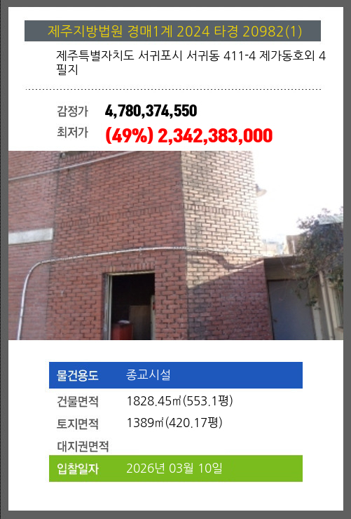 서귀포종교시설경매 서귀포시 서귀동 411-4 제가동호외 4필지 №2024 타경 20982(1)