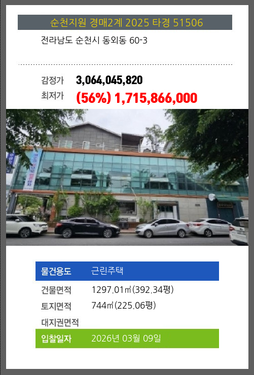 | 건물면적 | 1297.01㎡ (392.34평) | 채무자 | ㈜** | 최저가 | (56%) 1,715,866,000 |